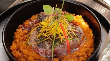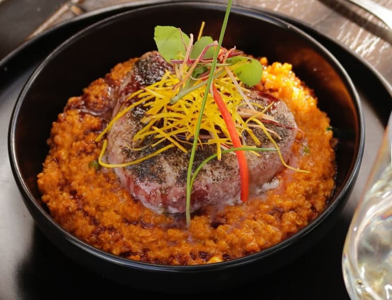 Lomo de atún ecuatoriano en costra de pimienta negra, bañado en reducción de chicha morada sobre cama de risotto de quinua.