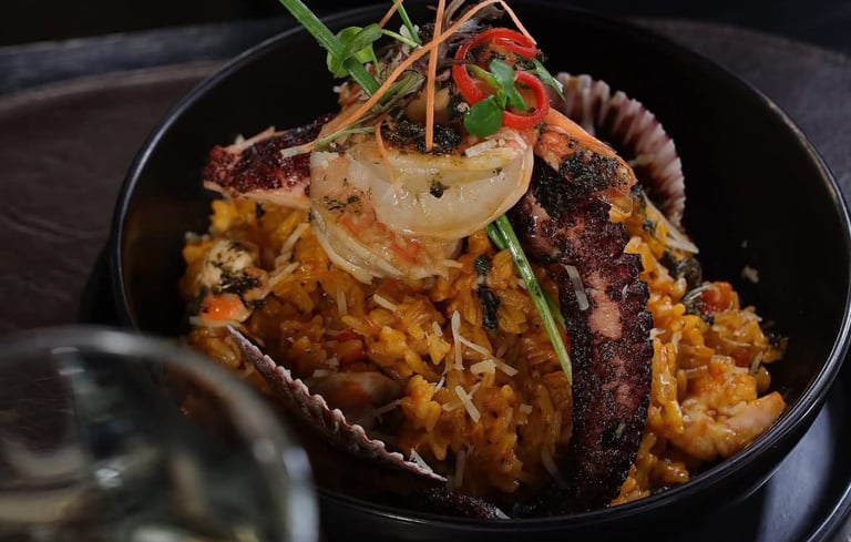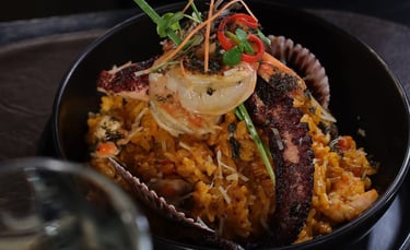 Camarones y arroz arbóreo guisado con salsa coral de camarón y crema de langosta.
