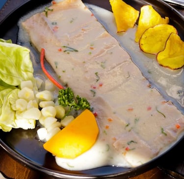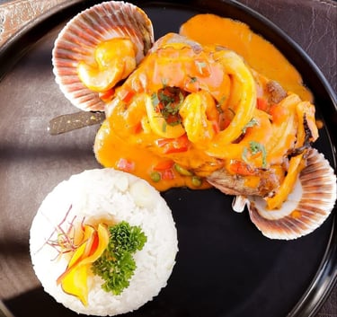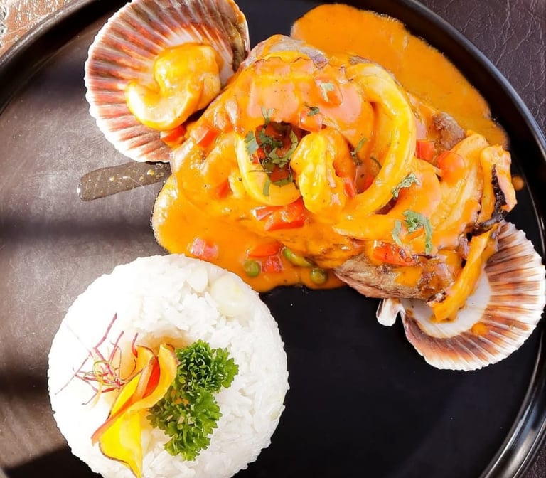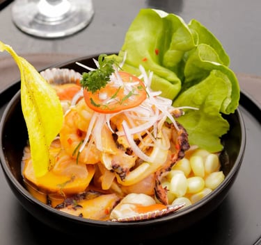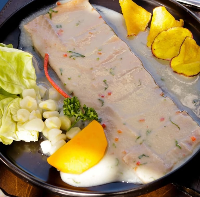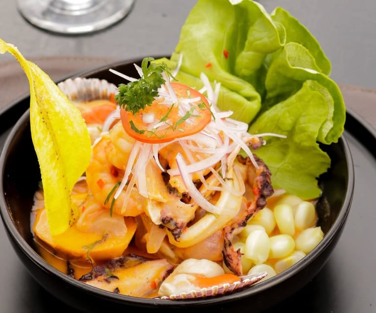 Reineta y mariscos frescos marinados con jugo de limón de Piura y salsa rocoto, acompañado de cebolla morada, camote y choclo.