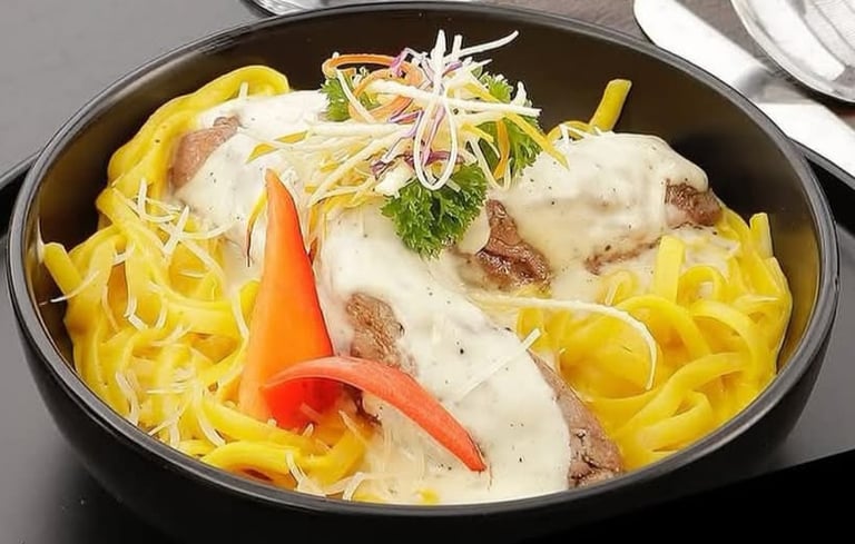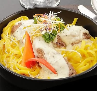 Típico lomo saltado llevado a la fusión, sobre una cama de fetuccini a la huancaína.