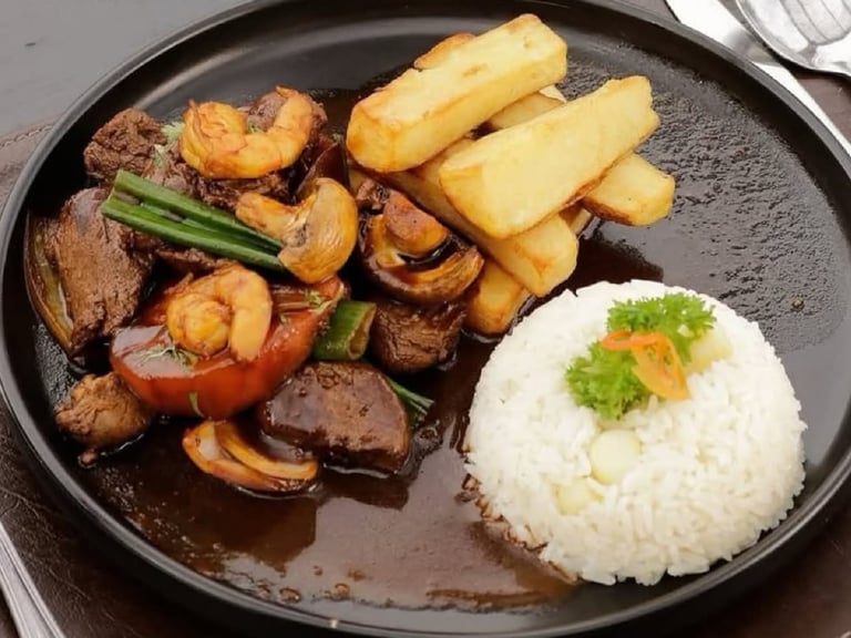 Tradicional lomo saltado llevado a la fusión costeña con camarones, champiñones, papas fritas crocantes y arroz con choclo.